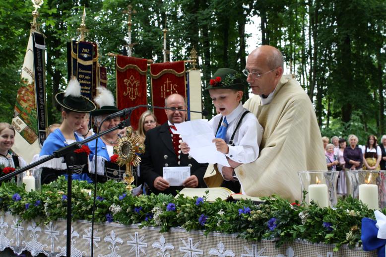 Der Sonntag zeigte sich mit idealem Festwetter. Unter leicht verhangenem Himmel, der sich im Verlauf weiß-blau zeigte, mit einem angenehmen leichten Lüfterl, zogen die Trachtlerinnen und Trachtler zum Gottesdienst am Sommerkeller. Ein idealer Platz, um auch in innerer Einkehr den Dank für Gemeinschaft auszudrücken. Die Bäume erwiesen sich wie ein Dom aus Laub und das Vogelgezwitscher während des ganzen Gottesdienstes erzeugte eine Stimmung, die von allen Gottesdienstteilnehmern als einmalig bezeichnet wurde.