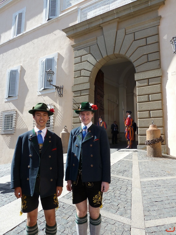 Während ihres 3-tägigen Aufenthaltes in der ewigen Stadt Rom haben die beiden neben dem beeindruckenden Petersdom auch sämtliche antike Bauwerke und die vatikanischen Museen mit der Sixtinischen Kapelle besucht. Nach einem Besuch der Villa d'Este am Freitag mit ihren wunderbaren Brunnen und Wasserspielen im Garten fuhr die Kolonne der 19 Busse mit eigener Polizeieskorte zum Castel Gandolfo (Sommerresidenz vom Papst) und schenkten so dem Heiligen Vater ein Stück bayrische Kultur und somit ein Heimatgefühl zu seinem 85. Geburtstag. "Trotz gefühlten 50 Grad unter der Volltracht bekam man doch noch eine Gänsehaut!" schwärmt Tobi. Sehr besonders war dann auch für die beiden, einen Gottesdienst am Samstag im Petersdom feiern zu können, der speziell für die riesige Bayerngruppe teilweise abgesperrt wurde, sodass hunderte Touristen mit filmen und fotografieren kaum mehr fertig wurden. "Wir waren fast eine größere Attraktion, wie der Petersdom selbst." staunt Martin. Als eine umso härtere Probe nach all dem VIP-Luxus in Rom erwies sich die Rückfahrt mit dem 440 Meter langen Sonderzug, der aufgrund eines Murenabgangs am Brenner und den darauf folgenden Umleitungen zu einer satten Verspätung von 330 Minuten führte!