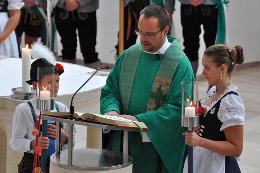 Die besondere Verbundenheit von Pfarrer Bernd Weidner spiegelte sich im ganzen Gottesdienst wieder. So ging er auf die Arbeit des Trachtenvereins auch im Hinblick auf das kirchliche Brauchtum ein. In seiner Begrüßung sprach er allen Trachtlern aus der Seele, als er die momentane „Trachtenwelle auf Volksfesten“ beleuchtete. „Da geht Gott und die Welt auf die Wiesn in Tracht – oder was sie dafür halten, trinken und steigen auf die Tische, um bayerisches Brauchtum zu zelebrieren – oder was sie dafür halten.“ Einen besseren Fürsprecher für unseren Wahlspruch „Sitt und Tracht der Alten wollen wir erhalten“ können wir gar nicht haben.