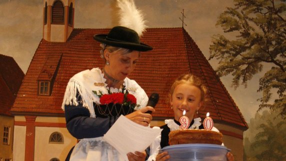 Zum Auftakt gratulierte Lea-Sophie Oppenländer (im Bild mit Mama Alexandra, welche durch den Abend führte) mit einer Geburtstagstorte, die sie aber gleich wieder mitnahm, denn „für alle im Saal reichts net“.