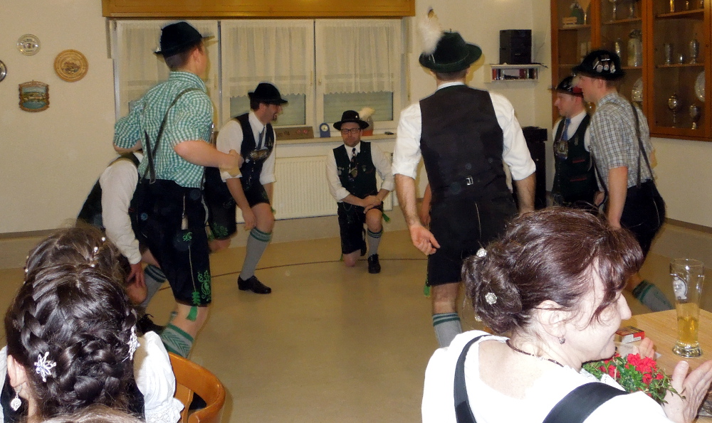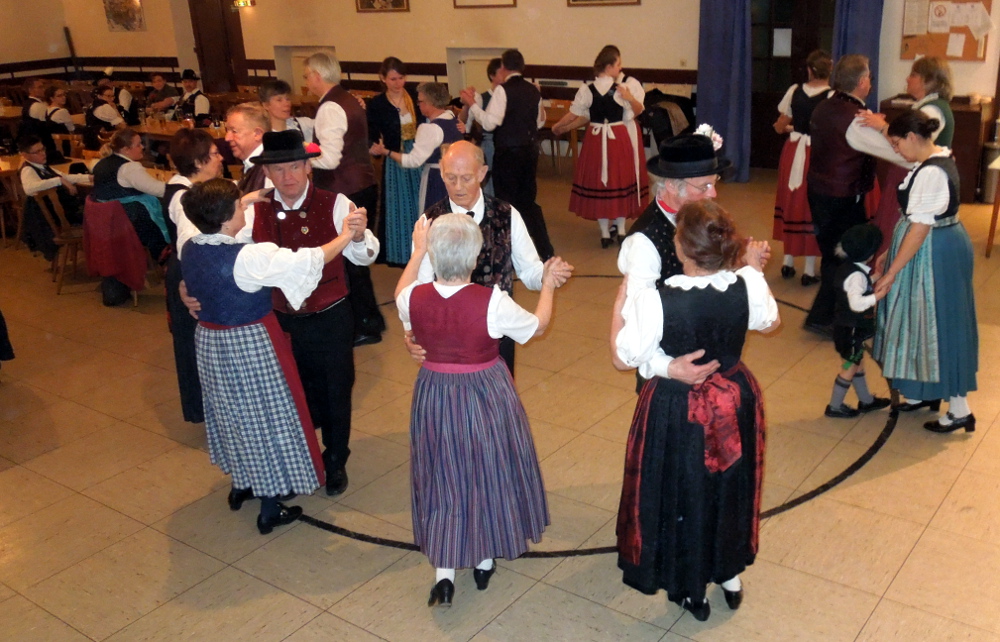 Zuerst probten im großen Saal abwechselnd Tänzer und Plattler. Später übten die Plattler und Dreherinnen und die Tänzerinnen und Tänzer in getrennten Räumlichkeiten. Ein breites Repertoire durch Tänze und Plattler wurde gemeinsam bestritten. So stand unter anderem der Gautanz, die Glockenpolka und die Rheinländer Kutsche auf dem Programm der Volkstänze. Erika Schneider leitete die Tänze an. So wurden die Figuren und der Ablauf zuerst kurz erklärt und gezeigt und dann der Tanz gemeinsam begonnen. Die beiden Gauvorplattler Toni Kürzinger und Albert Müller hatten unter anderem den Gauschlag, den Ammerseer und den Andorfer auf der Liste der Plattler. Auch das Dirndldrehn wurde geübt.