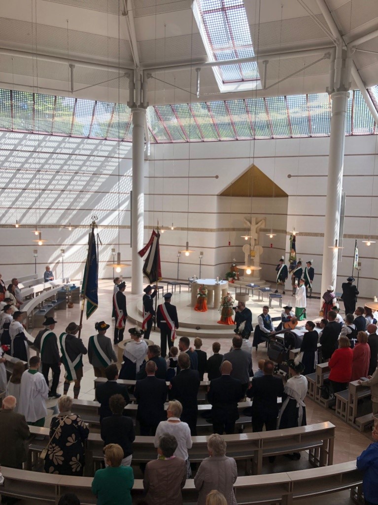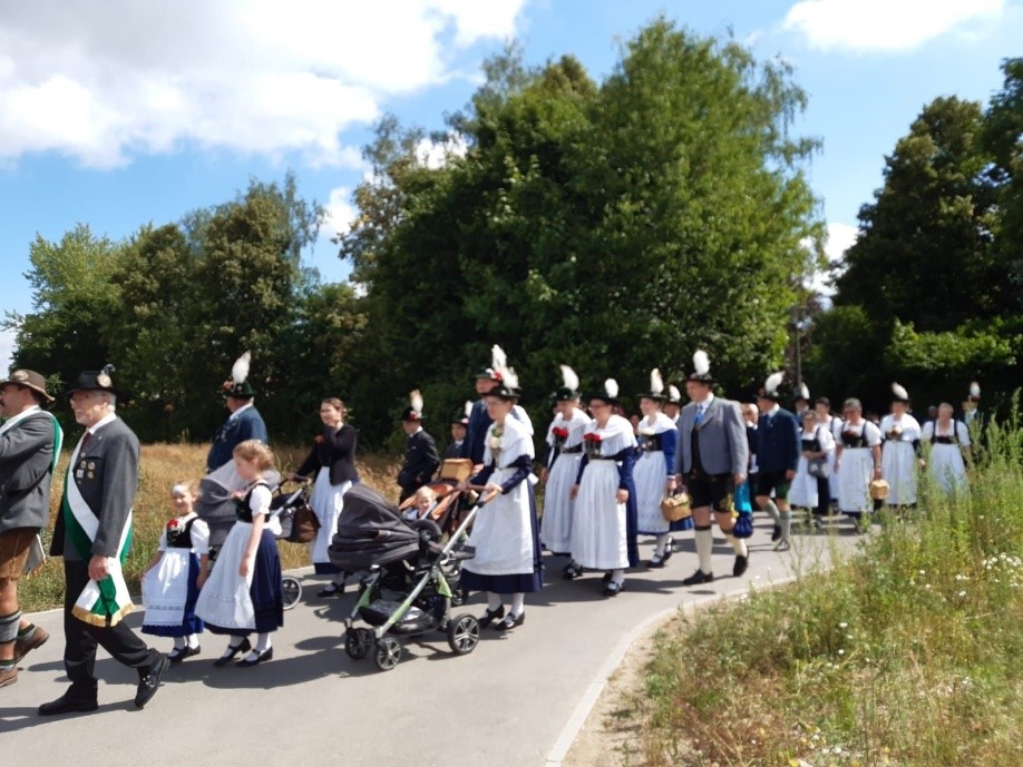 Zunächst fand ein Festgottesdienst in der Kirche Maria unter dem Kreuz statt, welcher von der Feichtecker Musi musikalisch umrahmt und von der Jugend durch Fürbitten gestaltet wurde. Im Anschluss machten sich die Trachtlerinnen und Trachtler mit den befreundeten Vereinen - wie der Trachtengruppe Ungstein, der freiwilligen Feuerwehr Königsbrunn und den Brunnenschützen- mit den Fahnenabordnungen auf dem Weg zum Feldkreuz. Begleitet wurde der Kirchenzug von dem Blasorchester Königsbrunn.