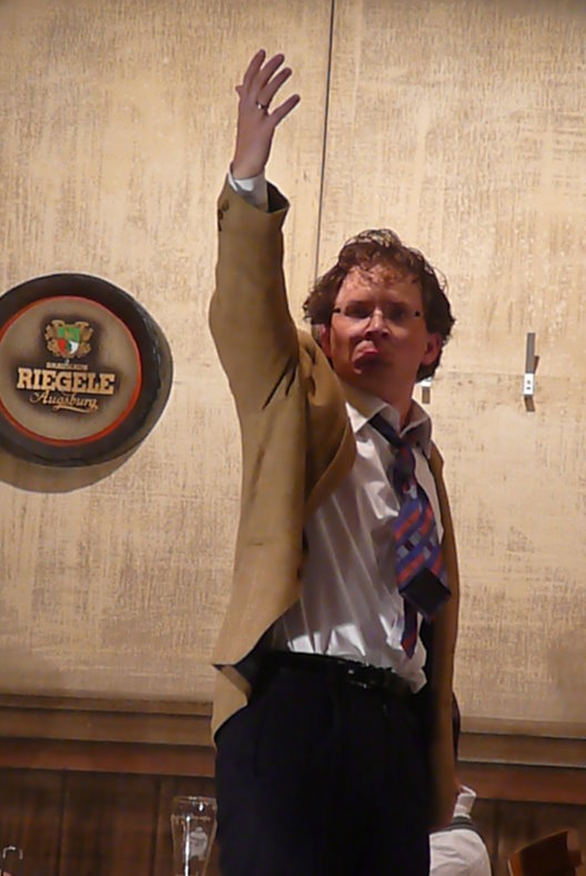 Einer der Höhepunkte war wieder einmal das Theaterstück. Mit Sebastian Fischer, seit Juli Ehemann von Vortänzerin Christine Fischer, konnte ein exzellenter Theaterspieler gewonnen werden, der in dem Drei-Personen-Stück alle Register seines komödiantischen Könnens gezogen hat. Hier bei der Proklamation von Auszügen von Schillers Glocke.