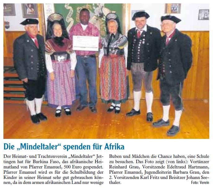 Die "Mindeltaler" aus Jettingen spendeten 500 Euro für die Schulkinder in Burkina Faso - dem Heimatland von Pfarrer Emanuel. Aktionen wie diese zeigen, dass die Trachtler gerne auch über den berühmten Tellerrand hinaus sehen - und auch das teilweise mühsam erwirtschaftete Vereinskapital hilfsbedürftigen Menschen zur Verfügung stellen.