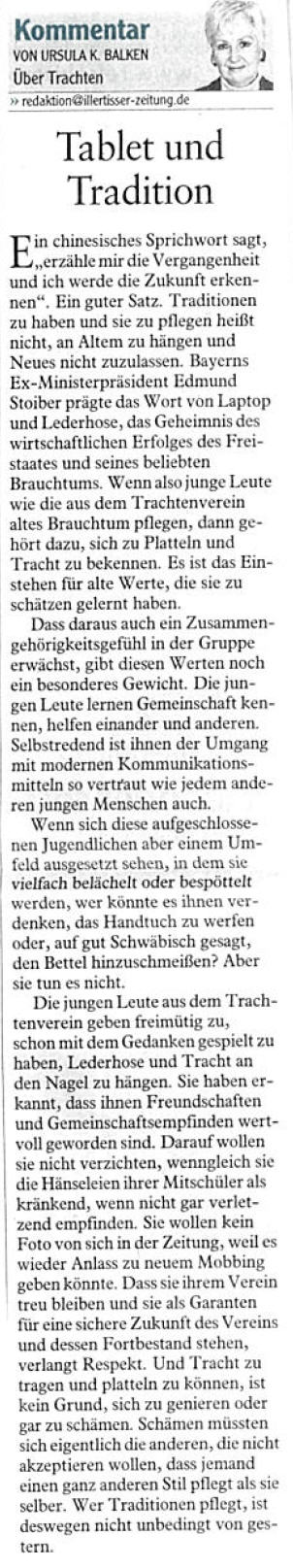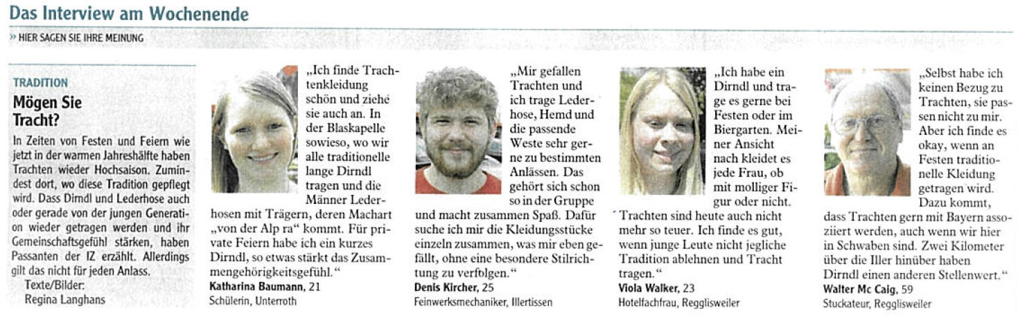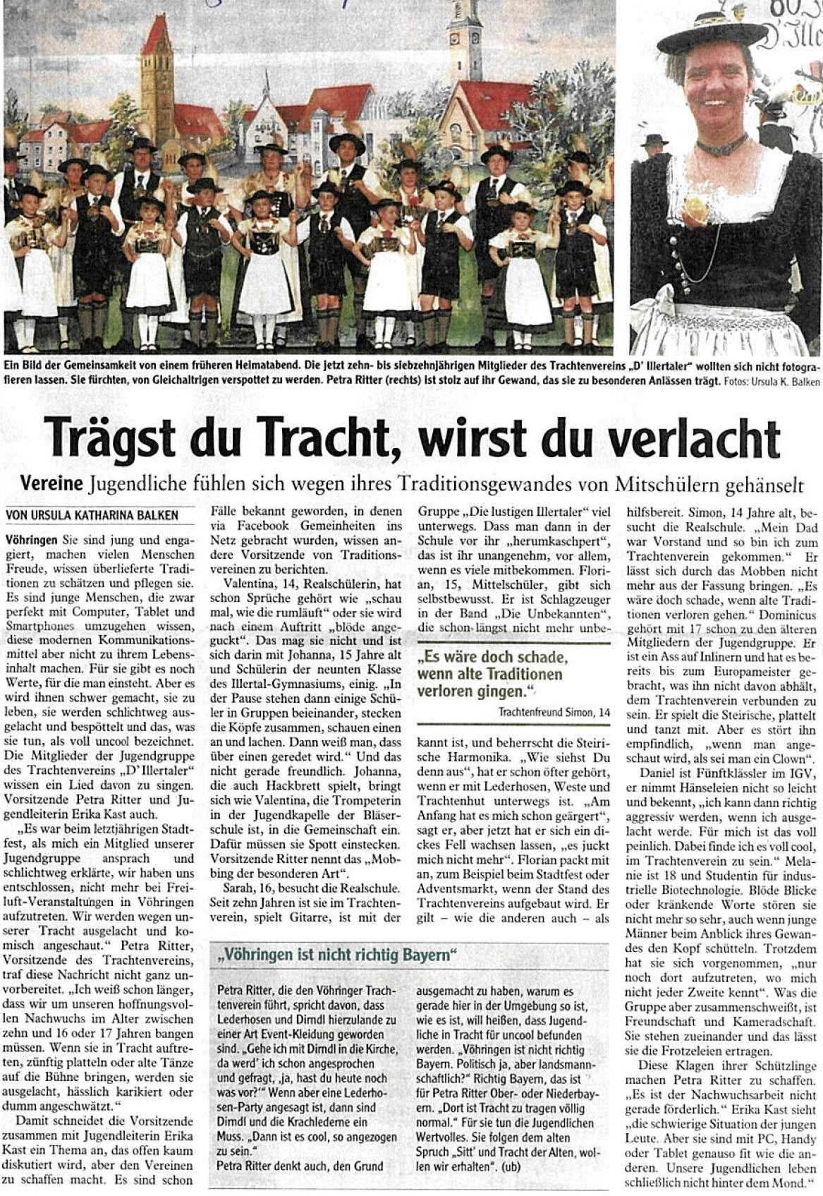 Ein Bericht über die manchmal durchaus kritische Gefühlslage von Jugendlichen in Trachtenvereinen. Petra Ritter, Vorständin in Vöhringen, war für das Anliegen ihrer Jugend offen - und die Pressevertreter nahmen dies zum Anlass für eine doch recht umfangreiche Berichterstattung (zum Vergrößern klicken):