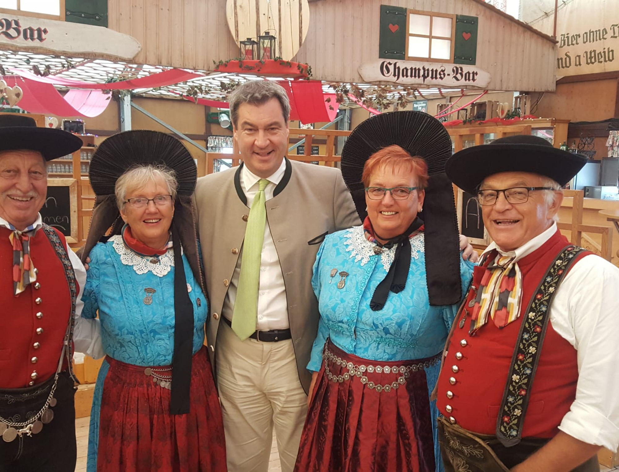 Zum Plärrerumzug am Samstag den 25. August machten sich einige Trachtler des Bezirks Burgau auf. Die Fahrt mit dem Zug nach Augsburg war ohne besondere Vorkommnisse. Einige fuhren mit dem Auto und standen im Stau. Nach einem kurzen Fußmarsch zu Maximilianstraße konnten wir dann auch bald unter den vielen Teilnehmern unsere Trachtenfreunde aus Lechhausen ausmachen. Nach und nach gesellten sich weitere Trachtler aus unserem Gau zu der Umzugsgesellschaft. So waren die Vereine Burlafingen, Senden und Jettingen beim Umzug vertreten. Kurz vor Beginn des Umzugs fing es ordentlich zu regnen an, so dass sich die Teilnehmer unter die Schirme der Gaststätten und in die Eingänge der Häuser flüchteten. Aber beim Umzugsbeginn regnete es nur noch leicht. Auf dem Weg zum Plärrer waren auffallend viele Zuschauer am Straßenrand, was den Umzug natürlich interessant und unterhaltsam machte. Im Binswanger Zelt war für uns reserviert, weil uns dort der Ministerpräsident des Freistaates Bayern Markus Söder begrüßen wollte. Was er auch nach einer kurzen Rede tat.