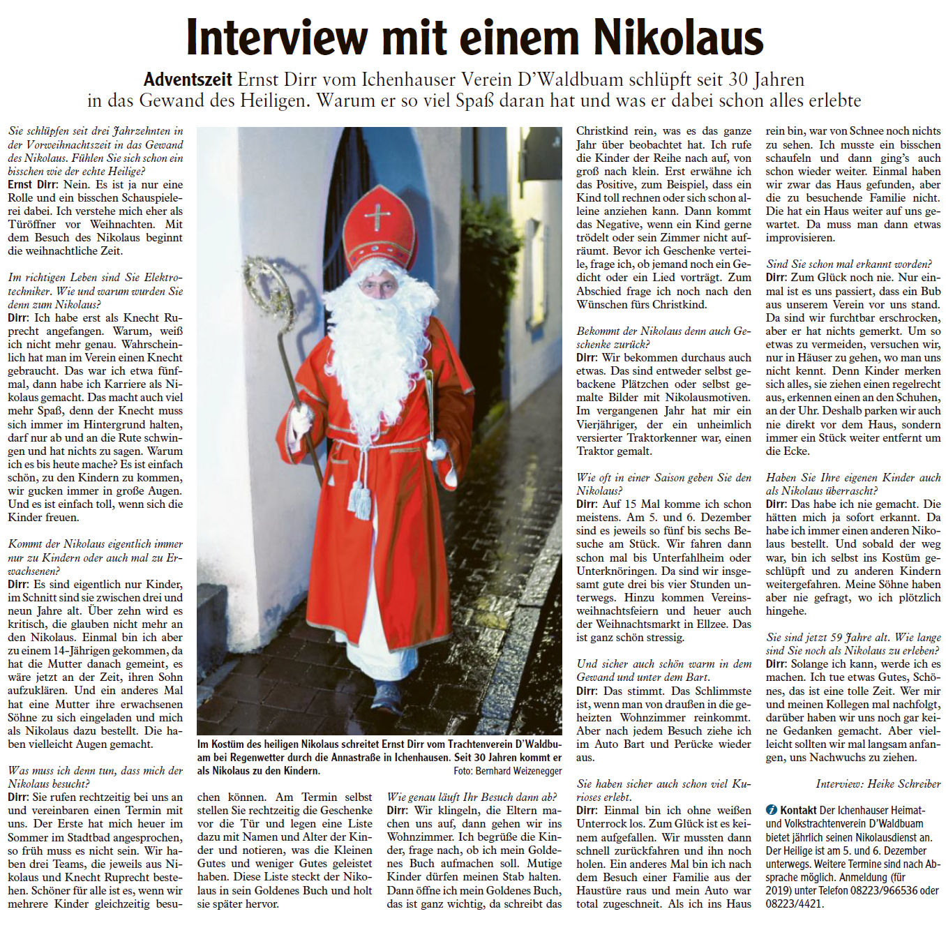 Am 05.12.2018 erschien in der Günzburger Zeitung der folgende Artikel über Ernst Dirr - Vorstand Ichenhausen - über sein Amt als Nikolaus...