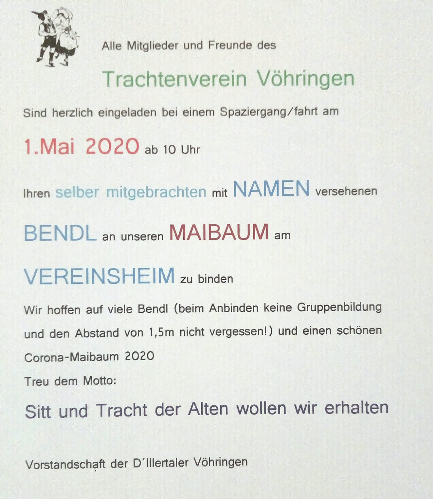 Aufgrund der hinlänglich bekannten Einschränkungen fiel selbstverständlich auch die traditionelle Maifeier der Vöhringer Trachtler aus. Dem Verein lag trotzdem viel daran die Tradition aufrecht zu erhalten und beschloss einen Baum in "abgespeckter" Form aufzustellen. Über die App, Zeitung und soziale Medien wurden alle Freunde und Gönner des Brauchtums aufgefordert bei einem Spaziergang am 1. Mai am Vereinsheim vorbeizuschauen und eine Bändel an den Baum zu hängen.