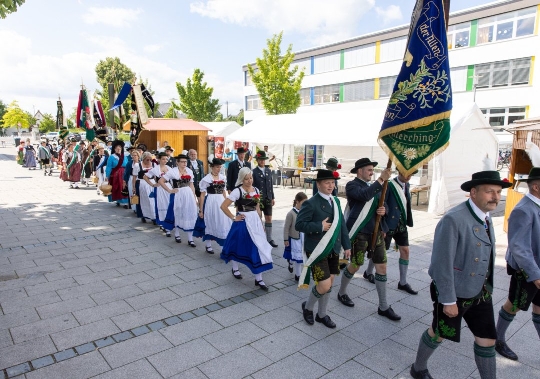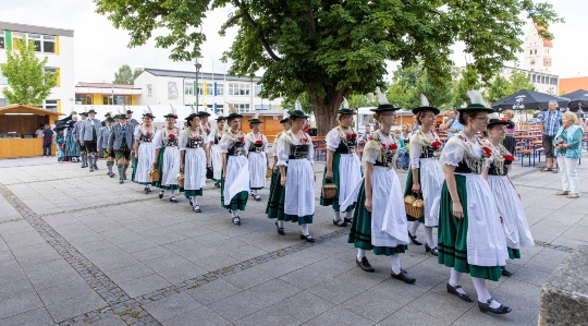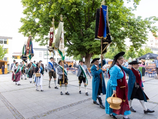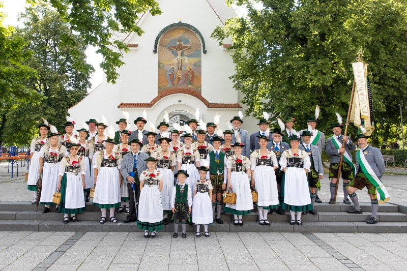 Wir haben das im Rahmen des Vöhringer Stadtfestes am 10.Juli 2022 gefeiert, und dieses mit unseren Plattlern, Tänzen und die vielen farbigen Trachten auch bereichert. Um 9.45 Uhr war Aufstellung zu Kirchenzug und wir marschierten mit unserer