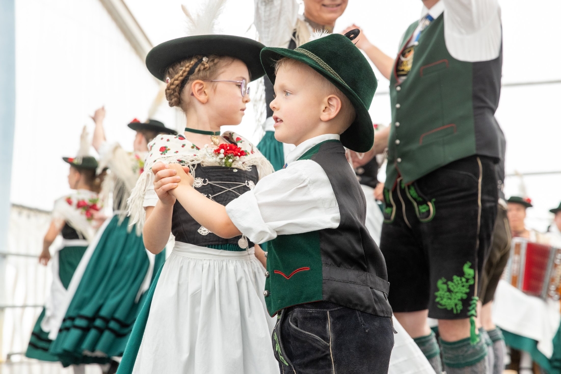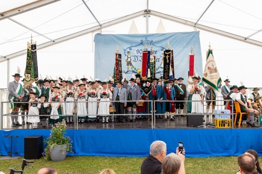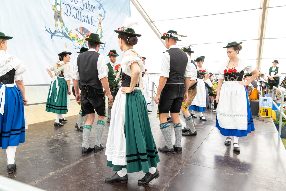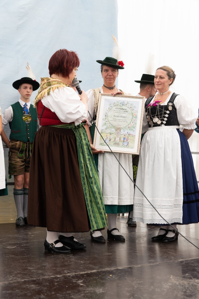 Nach dem Gottesdienst wurde im Festzelt auf dem Kirchplatz weitergefeiert. Neben der musikalischen Umrahmung durch die Trachtenkapelle Illerzell, wurden Tänze und Plattler unseres Vereins und der Gäste aufgeführt. Die Patenvereine Bayermünching Merching, und Ottobeuren überbrachten Glückwünsche und Geschenke und einige Mitglieder unseres Vereines erhielten aus der Hand des 1.Gauvorstandes Horst Müller das Gauehrenzeichen. Eine besondere Auszeichnung wurde unserer 1. Vorsitzenden Petra Ritter zuteil - sie bekam das Ehrenzeichen der Bayerischen Trachtenjugend durch die Vorsitzende des Bayerischen Trachtenjugendverbandes, Petra Eggersdorfer und Sabine Wiedemann vom Altbayerisch Schwäbischen Gauverband verliehen.