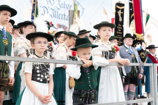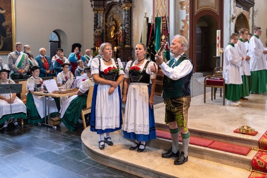 Vereinskapelle, der Trachtenkapelle Illerzell, den Fahnenabordnungen und Teilnehmern der Bezirks- und Patenvereine feierlich in die St. Michaelskirche ein. Der Festgottesdienst wurde musikalisch vom Christian Dreigsang aus Merching und