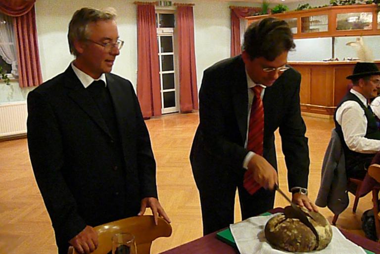 Eine Besonderheit beim Hoigartn war die Segnung und der Anschnitt des Hoigartenbrotes durch die beiden Geistlichen Pfarrer Bink und Stadtpfarrer Schaufler.