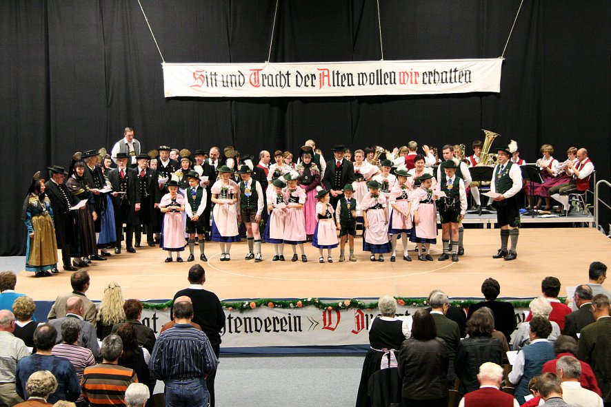 Ein beeindruckendes Bild ergab sich zum Abschluss der Veranstaltung als sich alle Teilnehmer auf der Bühne versammelten, um gemeinsam mit dem Publikum die Bayernhymne zu singen. Beim Verlassen der Halle wurde dem Trachtenverein von allen Seiten ein großes Lob für die mehr als 2 1/2 stündige Veranstaltung ausgesprochen.