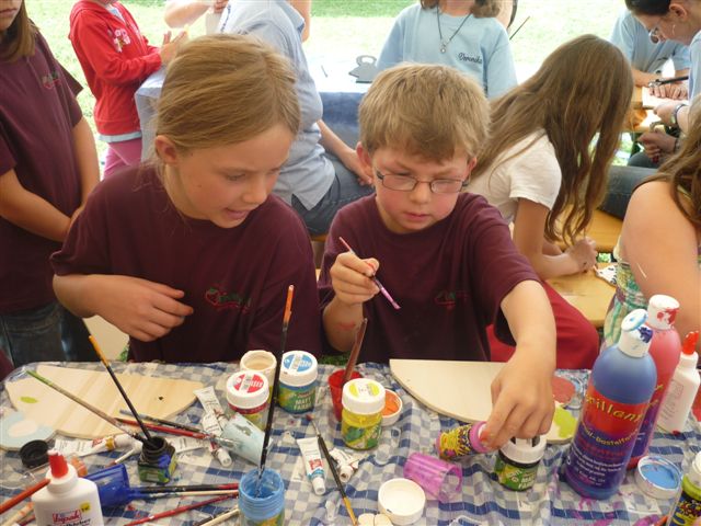 Dafür sägten wir Mäuse, Hasen und Fische aus Sperrholz aus und bemalten sie. Kreierten tolle Bilder mit der Farbschleuder (andere sagen Salatschleuder) und flechteten uns bunte Bänder.