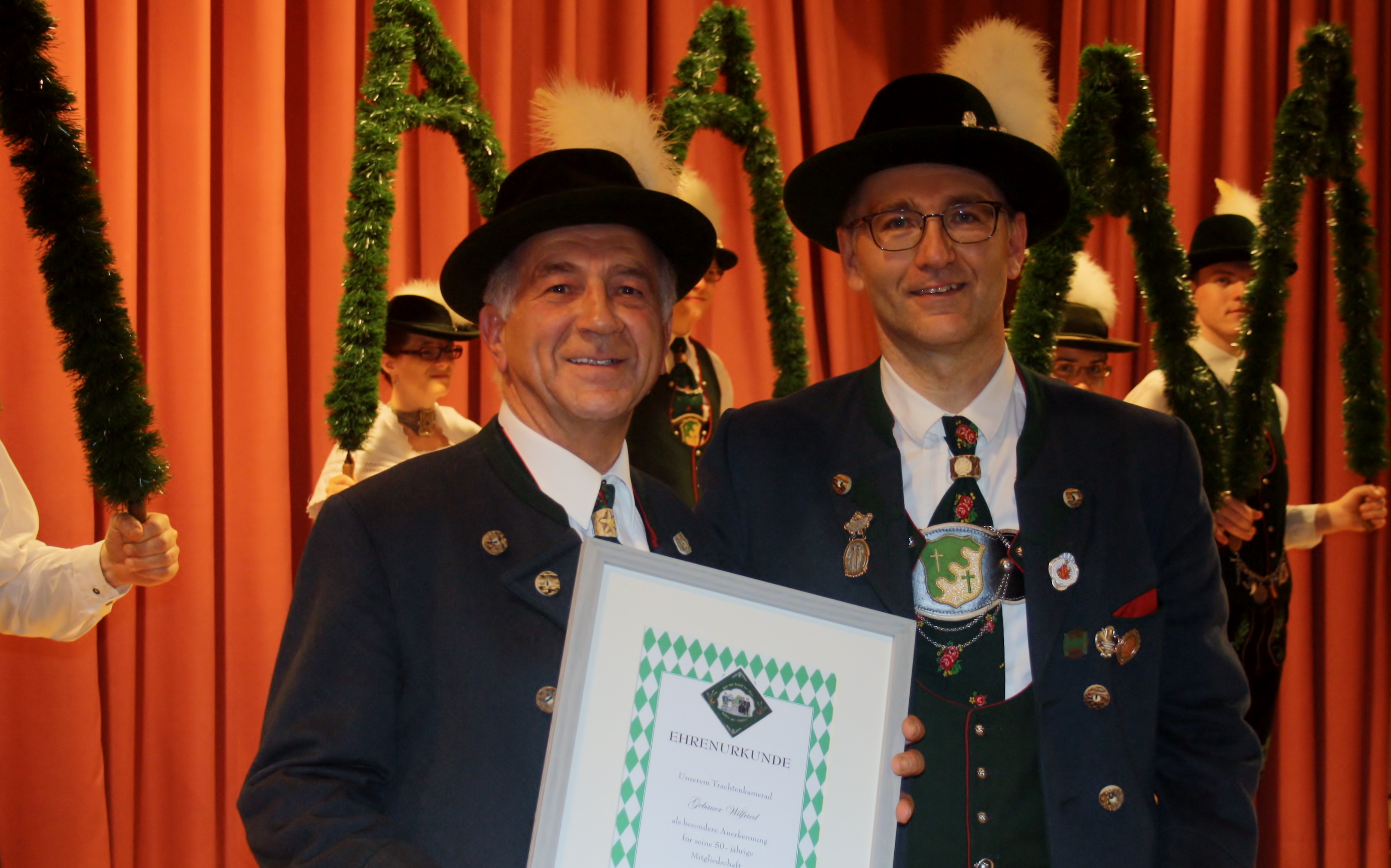 Eine besondere Ehrung durfte Günter Reitmeier an diesem Abend vornehmen. Wilfried Gebauer ist vor 50 Jahren dem Verein beigetreten und noch immer als Trachtenträger aktiv dabei. Vieles, was von Wilfried eingeführt wurde, ist noch heute fester Bestandteil im Vereinsleben, wie etwa die Waldweihnacht.