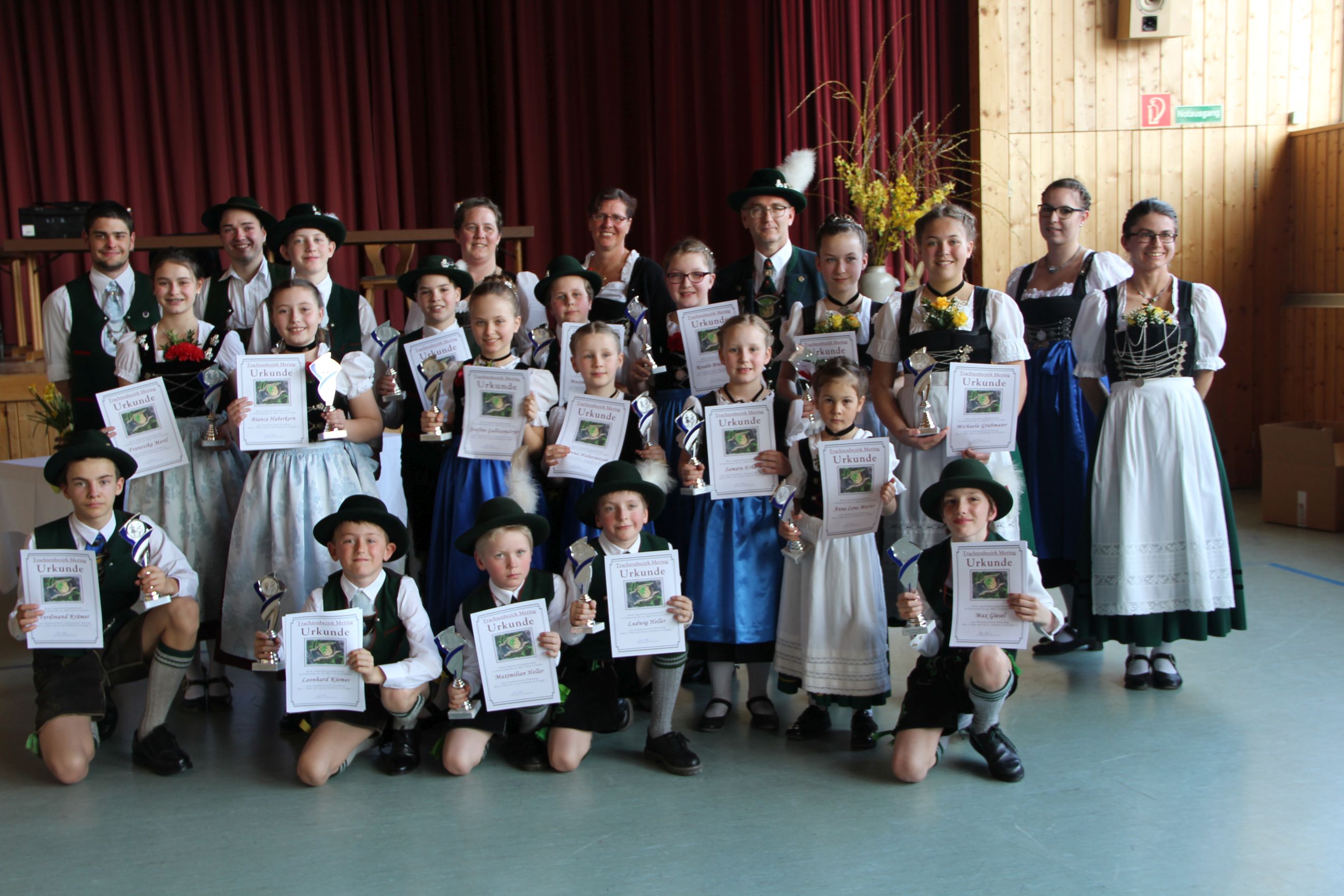 So trafen sich im März 27 junge Trachtlerinnen und Trachtler aus dem Bezirk Mering. Die jüngsten Teilnehmer mit 4 und 5 Jahren kamen aus Scheuring. Sie stellten sich wie alle Anderen auch den Anforderungen und den strengen Augen der 4 Werter, Rudi Kopp aus Friedberg, Martin Meier aus Mering, Florian Zenelli aus Merching und Reinhard Steber aus Scheuring.