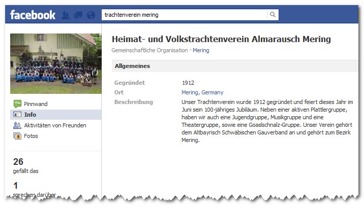 Der 1912 gegründete "Heimat- und Volkstrachtenverein Almarausch Mering" beschreitet neue Wege der Öffentlichkeitsarbeit. Seit Januar 2012 ist der Verein auch bei Facebook erreichbar: