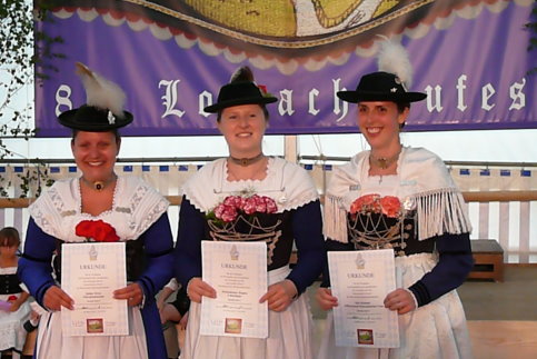 Bei den aktiven Deandln der Altersklasse 17 – 34 Jahre war Steffi Sixt (rechts) aus Königsbrunn mit nur einem halben Punkt Rückstand auf die Siegerin punktgleich mit der Zweiten. Lediglich die höhere Startnummer entschied über Platz 2 und 3. Bei den Deandln von 19 – 13 Jahre setzte sich Anna Schmid mit Platz 3 durch.