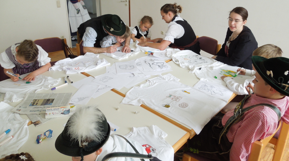 Am Nachmittag gab es zwei Werkstätten, die Gruppe wurde geteilt und die Programme liefen parallel, nach der Halbzeit wurde getauscht. Für einen Kurs war Christoph Lambertz von der Volksmusikberatungsstelle des Bezirk Schwabens als Referent angereist. Er sang mit den Kindern und Jugendlichen. Sämtliche Lieder zu, mit und über Tiere hatte er im Gepäck. Der andere Kurs bemalte T-Shirts. Es gab einige Vorlagen und Anregungen für Motive und am Ende waren sehr kreative und künstlerische Sachen zu bewundern.