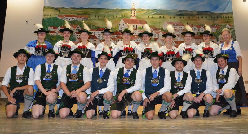 Dirndl v. li.: Simone Vötter/Mering, Lisa-Marie Oppenländer/Königsbrunn, Stefanie Riedl/Gersthofen, Sophia Dachs/Königsbrunn, Elvira Wild/Lechhausen, Regina Schäble/Königsbrunn, Sabrina Kürzinger/Lechhausen, Julia Röthinger/Königsbrunn, Stefanie Brenner/Königsbrunn, Gauvorstand Marianne Hinterbrandner