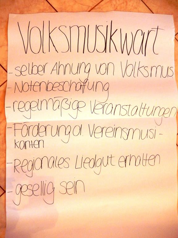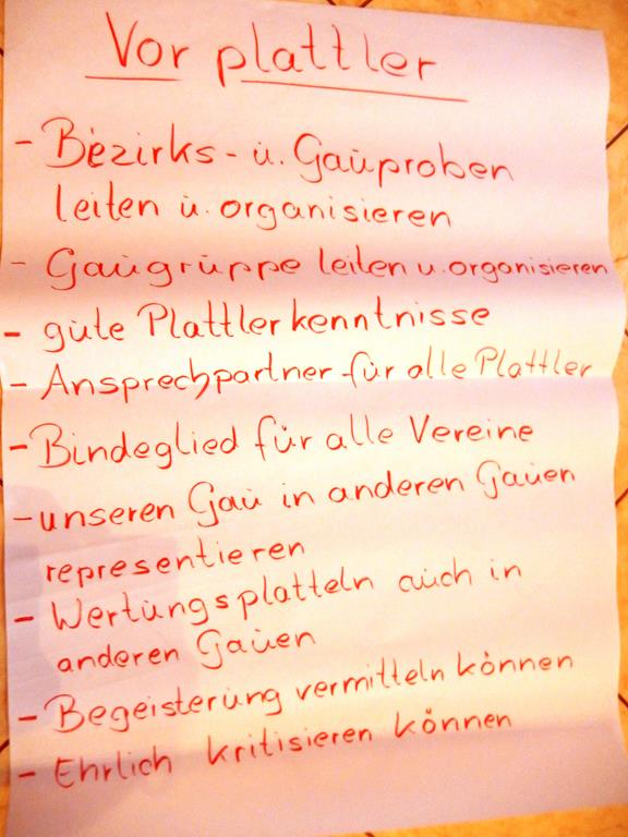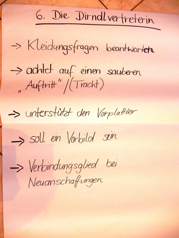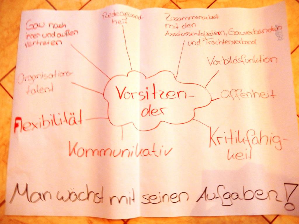 Bereits im Januar bei der Gauschulung wurde diese Thematik mit den jungen Trachtlern intensiv besprochen und in Gruppenarbeiten bearbeitet. Das Ergebnis dieser Gruppenarbeiten mit den gewünschten Anforderungen an ein Amt wurde den Delegierten auch visuell vor Augen geführt.