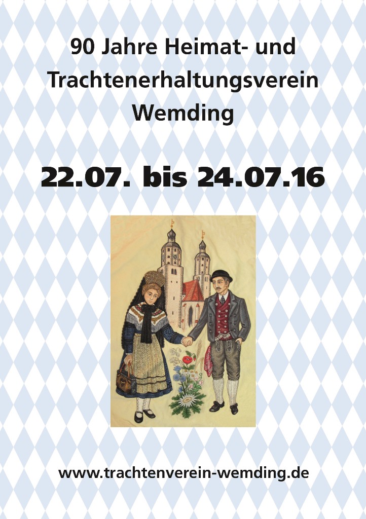 Der Heimat- und Trachtenerhaltungsverein Wemding feiert sein 90-jähriges Gründungsjubiläum vom 23.-24. Juli 2016 zusammen mit den Gaufesten der Vereinigung links der Donau und dem Altbayrisch-Schwäbischen Gauverband.