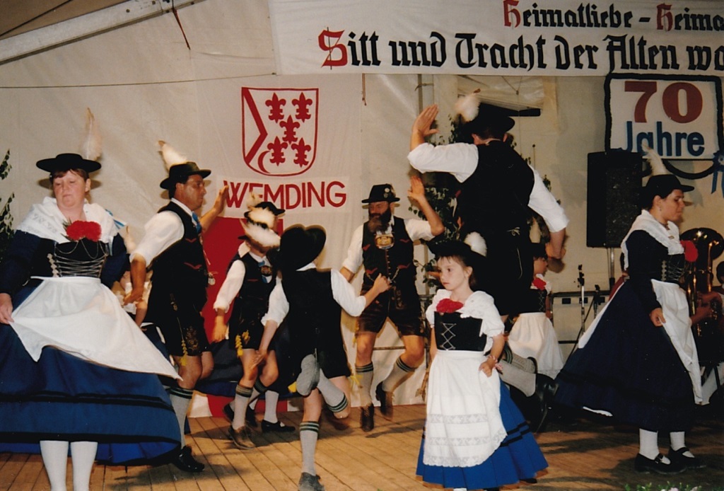 1996 wurde unser 70 jähriges Gründungsjubiläum mit einem Rieser Bezirkstrachtenfest gefeiert. Überschattet wurden die Feierlichkeiten vom Tod unseres letzten Gründungsmitgliedes und Ehrenvorstandes Anton Neubauer sen., welcher bei allen im Trachtenverein als Bauerntoni bekannt war.
