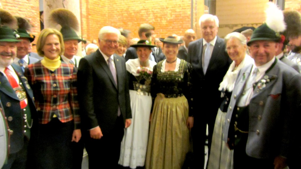 Zu seiner Begrüßung bildeten die Mitglieder des Landesausschusses des Bayerischen Trachtenverbandes ein Ehrenspalier für den Präsidenten. Gemeinsam mit Elke Büdenbender, Horst Seehofer und dessen Frau Karin war er beim Durchschreiten des Ehrenspaliers sichtlich erfreut und beeindruckt von der Farbenpracht und Vielfalt der bayerischen Trachten.