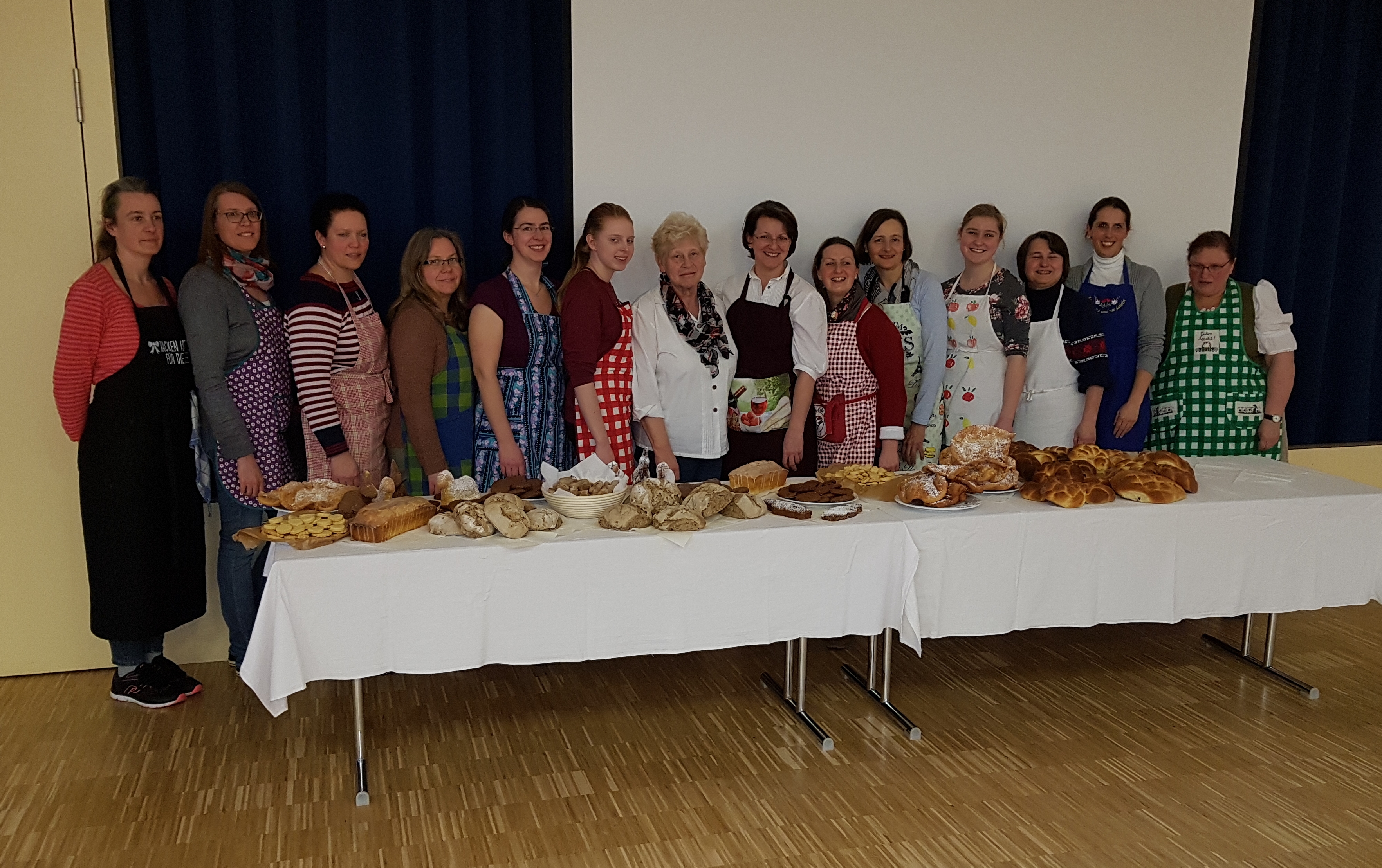 Am Samstag 10.03.2018 um 9.00 Uhr in der Früh, trafen sich 12 interessierte Trachtlerinnen aus dem gesamten Gaugebiet, um mit Gisela Haußner in die Welt der Brauchtumsbäckerei einzutauchen. Bereits beim Anblick der Zutaten war allen klar, dass wir uns nicht zum gemütlichen Ratschen mit ein bisschen Backen treffen. Die Räumlichkeiten in Graben wurden von Elfriede und Donald Gralheer, zusammen mit den Mitgliedern des Trachtenvereins Lechfeld, bestens für die nächsten zwei Tage vorbereitet. Mit dieser Rundumversorgung im Rücken konnten sich alle auf das Wesentliche konzentrieren – „Brauchtumsbäckerei im kirchlichen Jahreskreis“. Mit Bildern und vielen kleinen Geschichten brachte Gisela uns nahe, was früher zu bestimmten Anlässen gebacken wurde, und auch warum. Nach dieser theoretischen Einführung war Schluss mit „faulenzen“ und es wurde gebacken. Unmengen an verschiedenen Teigen wurden hergestellt und je nach Anlass entsprechend geformt. Erstaunlich, wann früher immer gebacken wurde. Am ersten Tag wurden unter anderem Osterlamm, Osterfladen, Barbarakuchen, Johanniplätzchen, Schmalzgebäck zu Kirchweih, Lebkuchen, Seelenzöpfe, Blasiusbrot und Kräuterbrot zu Maria Himmelfahrt hergestellt. Schnell füllte sich der Tisch mit all den Leckereien und es musste „angebaut“ werden. Der Sonntag war nicht weniger interessant. In Kleingruppen wurden wieder schüsselweise Teige hergestellt und zu Schmalzgebäck, Rahmfleck welche auf Michaeli-Märkten Brauch sind, verschiedenen Gebäcken zu Dreikönig, Lucia-Schnecken, Martinsgänse, Augsburger Friedenstauben und Josefsbrot. verarbeitet. Auch die Wünsche der Teilnehmerinnen wurden berücksichtigt, und so haben einige zum ersten Mal in Ihrem Leben „Auszogne“ gebacken. Außerdem haben wir uns in der Herstellung von Gebildbroten versucht. Selbstverständlich wurden wir währen der gesamten Zeit von Gisela und ihrem Mann Georg mit fachlichen Ratschlägen unterstützt und mit Hintergrundinformationen zu den verschiedenen Feierlichkeiten versorgt. Und wie es in so einer Runde üblich, kam der Austausch nicht zu kurz. Ganz sicher werden wir das neu erworbene Wissen im Jahresverlauf weitergeben. Und wenn es in nächster Zeit aus einigen Vereinsheimen verführerisch duftet, ist hier sicherlich eine Teilnehmerin dieses Wochenendes am Werk. (Ulrike Riedl)