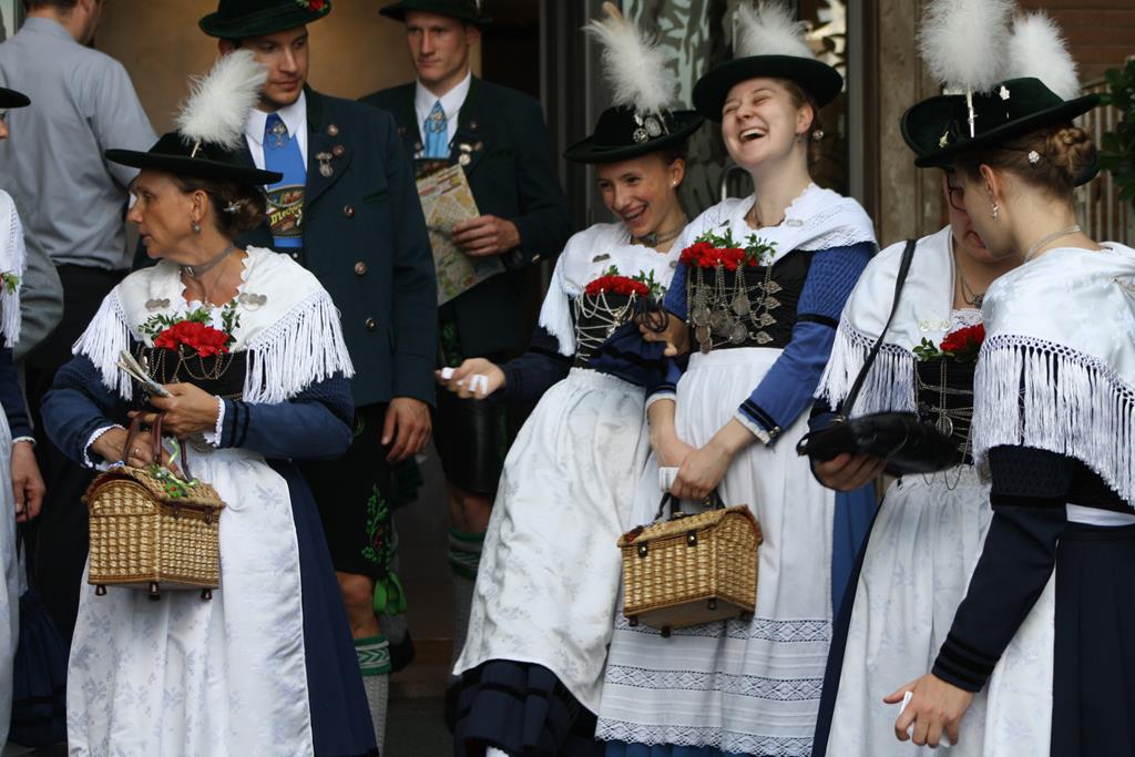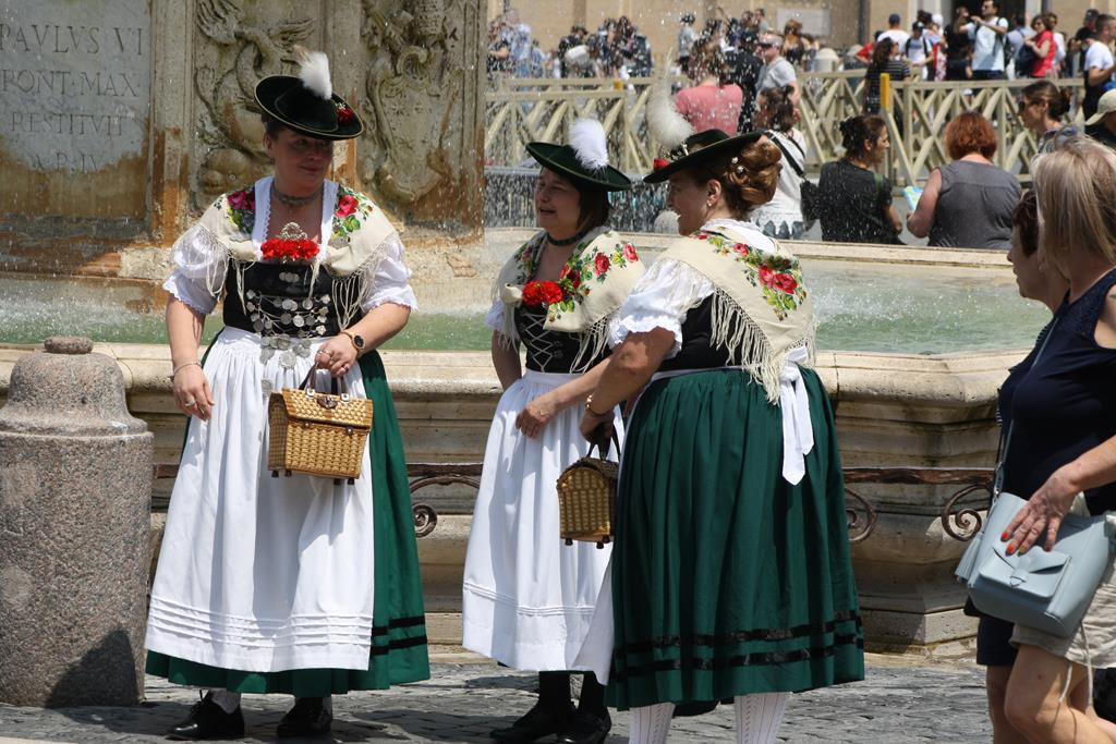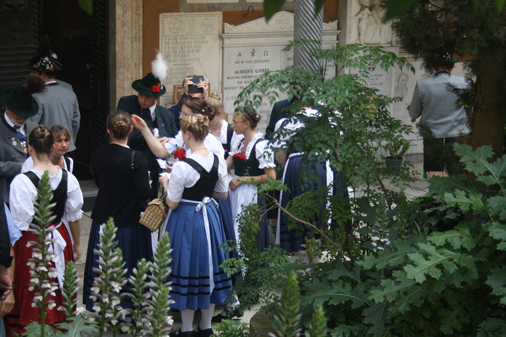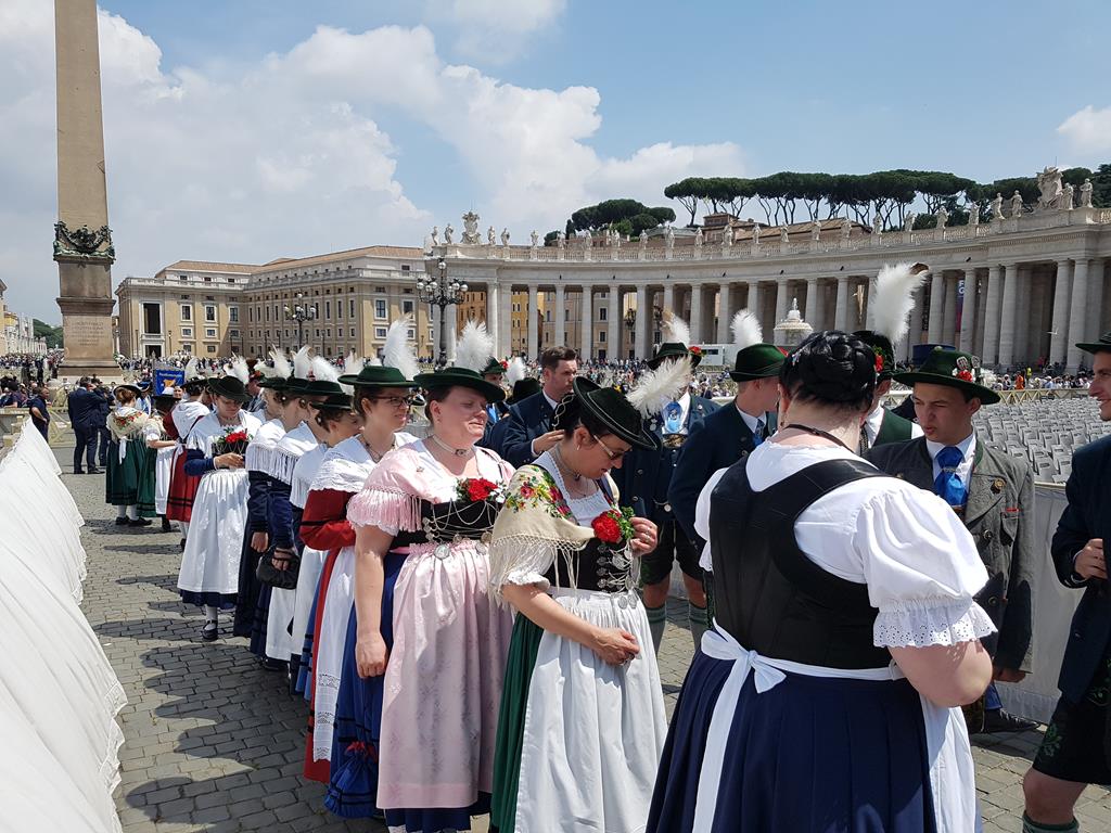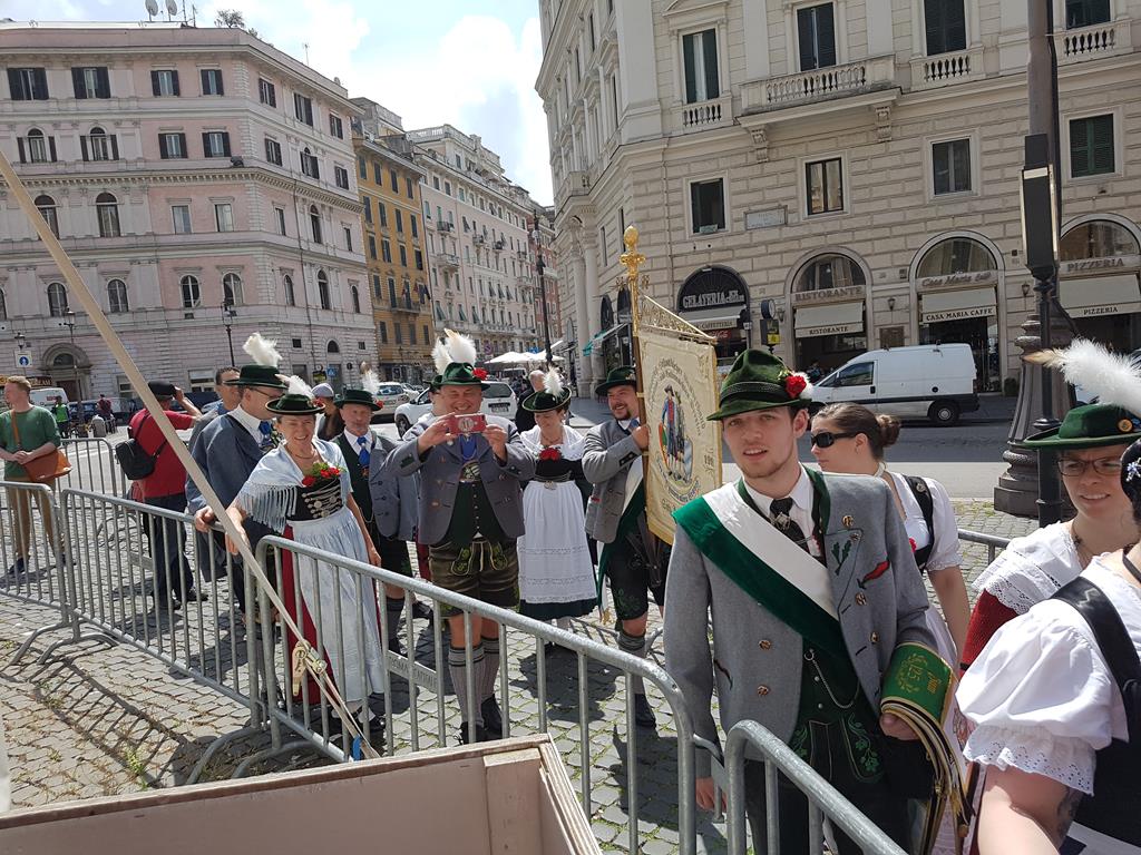 Vor meinem Bericht muss ich noch eine Zeile voranschicken: Ich war noch nie so stolz, Trachtlerin zu sein als an diesem Freitag, den 11. Mai 2018, als ich unter strahlendem weiß-blauen Himmel mit weiteren 40 Trachtlerinnen und Trachtlern sowie Pfarrer Bernd Leumann aus Königsbrunn hinter unserer Standarte in den Petersdom in Rom eingezogen bin! Das Gefühl war unbeschreiblich und erzeugt allein bei dem Gedanken daran eine Gänsehaut.