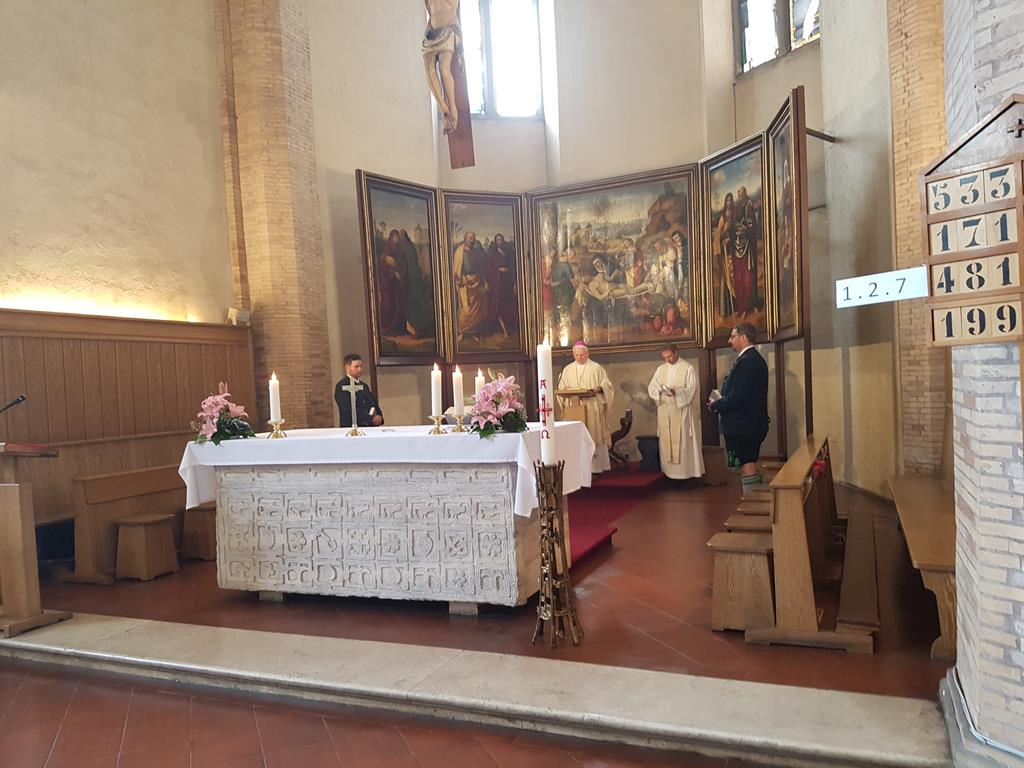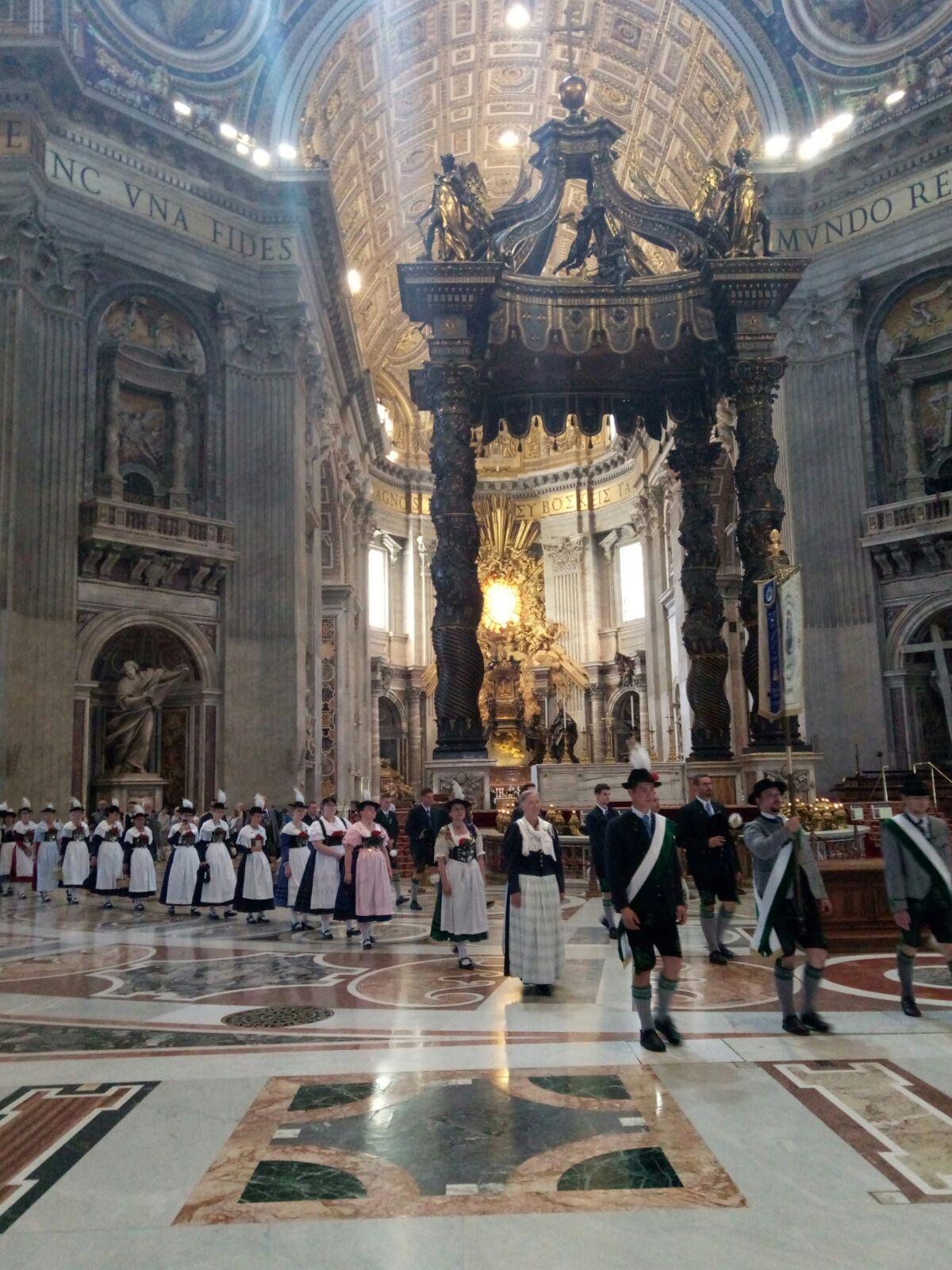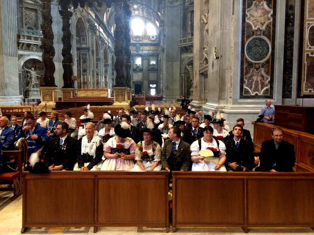 Die Südtiroler Kapelle St. Johann im Ahrntal, Nähe Bruneck, führte uns mit einem stilvollen feierlichen Marsch quer über den Petersplatz zum Hauptportal des Petersdoms und wir zogen durch den langen Mittelgang des Doms vor bis zum Hauptaltar. Dort wurde es sehr ruhig, war es doch ein Platz, der für den normalen Besuchsverkehr geschlossen war. So feierten wir für uns gemeinsam mit den Südtirolern und dem Fanfarencorp Blaufelden aus der Nähe von Crailsheim einen feierlichen Gottesdienst. Zelebriert wurde dieser von Prof. Dr. Hans-Peter Fischer, Rektor am Campo Santo Teutonico. Konzelebrant war unser Pfarrer Bernd Leumann, für einen schwäbischen Pfarrer auch nicht unbedingt alltäglich.