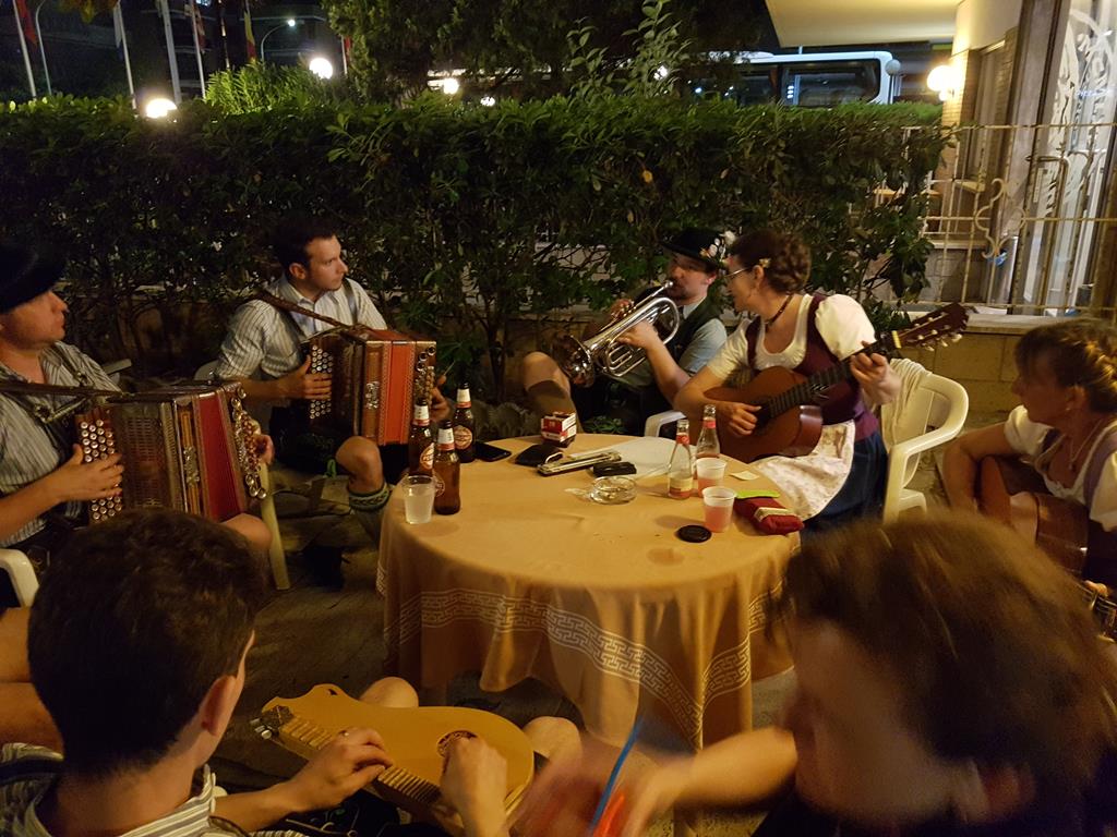 Schade, dass wir relativ früh aus Rücksicht auf andere Gäste und die Anwohner das Musizieren einstellen mussten. Wir brachen deshalb unsere Zelte ab und verlegten Alles in den Hotelgarten. Dort waren die Musikanten noch lange zugange – wie es bei Musikanten halt so ist.