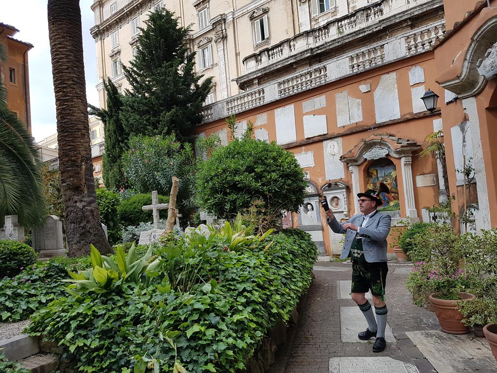 Der Sonntag bot einen weiteren Höhepunkt. Mit Pfarrer Leumann feierten wir in der Kirche des Deutschen Friedhofes einen gemeinsamen Gottesdienst. Zelebrant war Bischof Dr. Josef Clemens, dienstältester Deutscher Theologe im Vatikan. Kleines Bonmot am Rande: Pfarrer Leumann probierte, ob ihm das Zucchetto des Bischofs passt …..