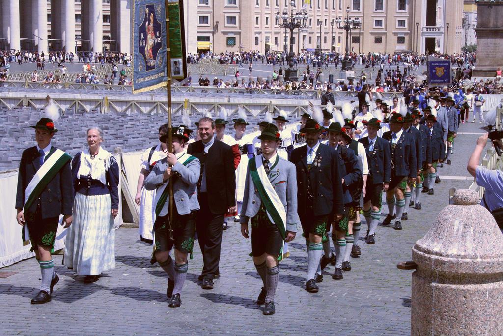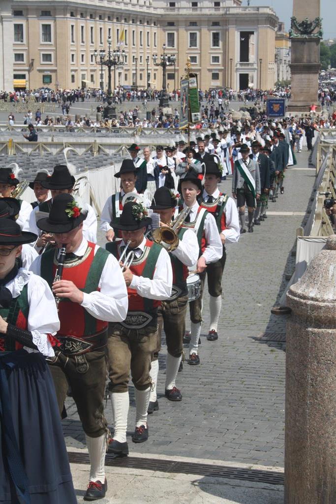 Dann war es endlich so weit. Wir waren auf dem Petersplatz angekommen. Die angekündigten polizeilichen Sicherheitskontrollen waren schnell erledigt. Die Metalldetektoren gaben beim Trachtenschmuck den Geist auf und wenn es nicht gerade ein Messer war wurden wir schnell durchgewunken.