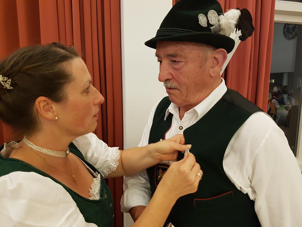Gaujugendleiterin Sabine Wiedemann bei der Überreichung des Ehrenzeichens. Der Dialog könnte lauten: Sabine:"Wo hast denn Deinen Kittel und die Krawatte? Albert: Im Auto!! Ja wenn ich gewusst hätte, dass ich geehrt werde, dann hätte ich ihn natürlich angezogen".