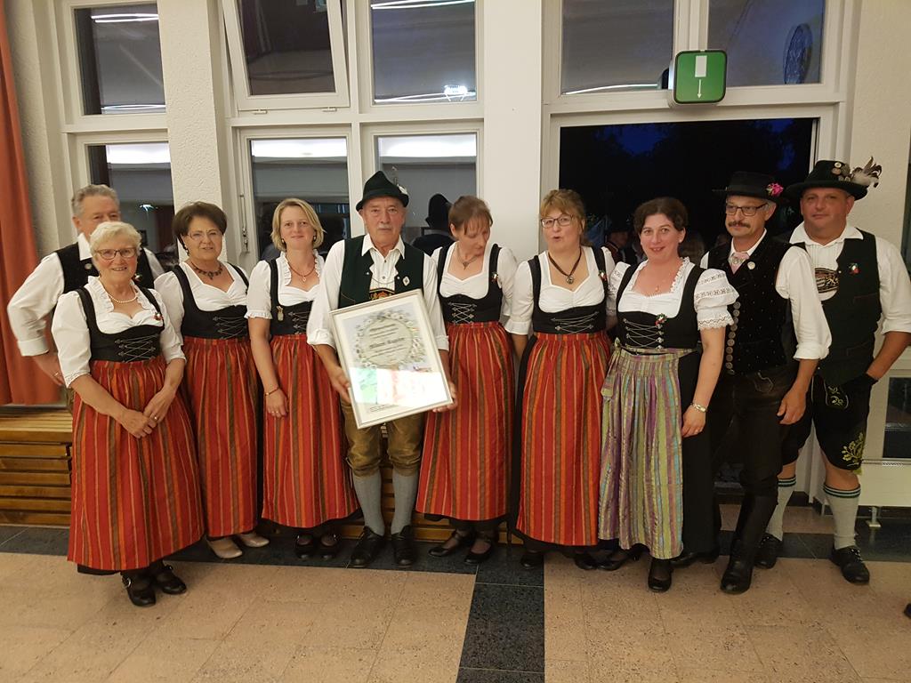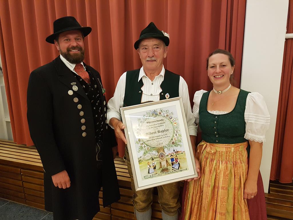 Diese Überraschung war gelungen: Im Rahmen des diesjährigen Gauballs wurde Albert Kapfer, Vorstand des Trachtenvereins "D'Roaner" Rain am Lech von Landesjugendvertreter Armin Schmid und unserer Gaujugendleiterin Sabine Wiedemann das Ehrenzeichen in Gold der Bayerischen Trachtenjugend verliehen. Wir bedanken uns besonders bei Armin Schmid für sein Kommen und die damit verbundene Wertschätzung unseres Geehrten. Albert Kapfer ist seit der Gründung des Trachtenvereins Rain am Lech immer in Verantwortung gestanden, ob als Jugendleiter, erster oder zweiter Vorstand, Bezirksjugendleiter oder Bezirksleiter des Bezirks Gundelfingen sowie als langjähriges Mitglied des Wallfahrtskomitees. Dabei lag und liegt ihm die Jugendarbeit besonders am Herzen. Der nun 76-Jährige (!) ist nach wie vor bei der Organisation des alljährlichen Zeltlagers des Bezirks Gundelfingen mit dabei. Sein Verein kann steigende Mitgliederzahlen vermelden und die Jugendleiter rennen bei ihm offene Türen ein!