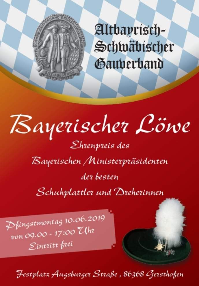 Der Ehrenpreis des Bayerischen Ministerpräsidenten der besten Schuhplattler und Deandldreherinnen, besser bekannt als Bayerischer Löwe, wird dieses Jahr beim Altbayrisch-Schwäbischen Gauverband ausgetragen! Gemeinsam mit dem Trachtenverein Gersthofen würden wir uns sehr freuen, wenn nicht nur die teilnehmenden Trachtlerinnen und Trachtler dabei sind, sondern auch alle Interessierten und Zuschauer am Pfingstmontag, 10. Juni 2019, im Festzelt Binswanger am Gersthofer Festplatz vorbeischauen (86368 Gersthofen, Augsburger Straße oder Gersthofen Festplatz ins Navi eingeben).