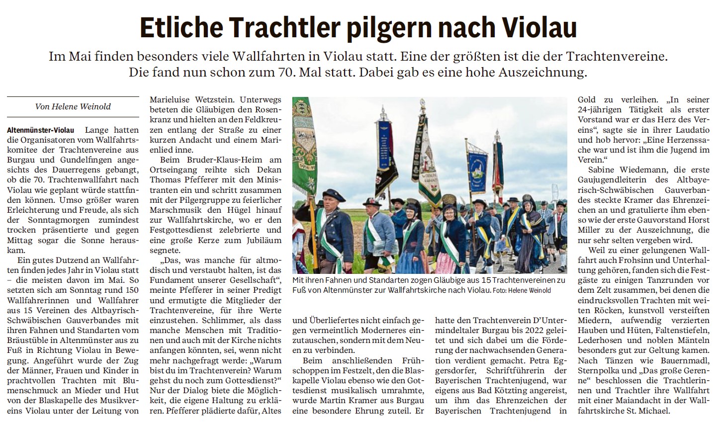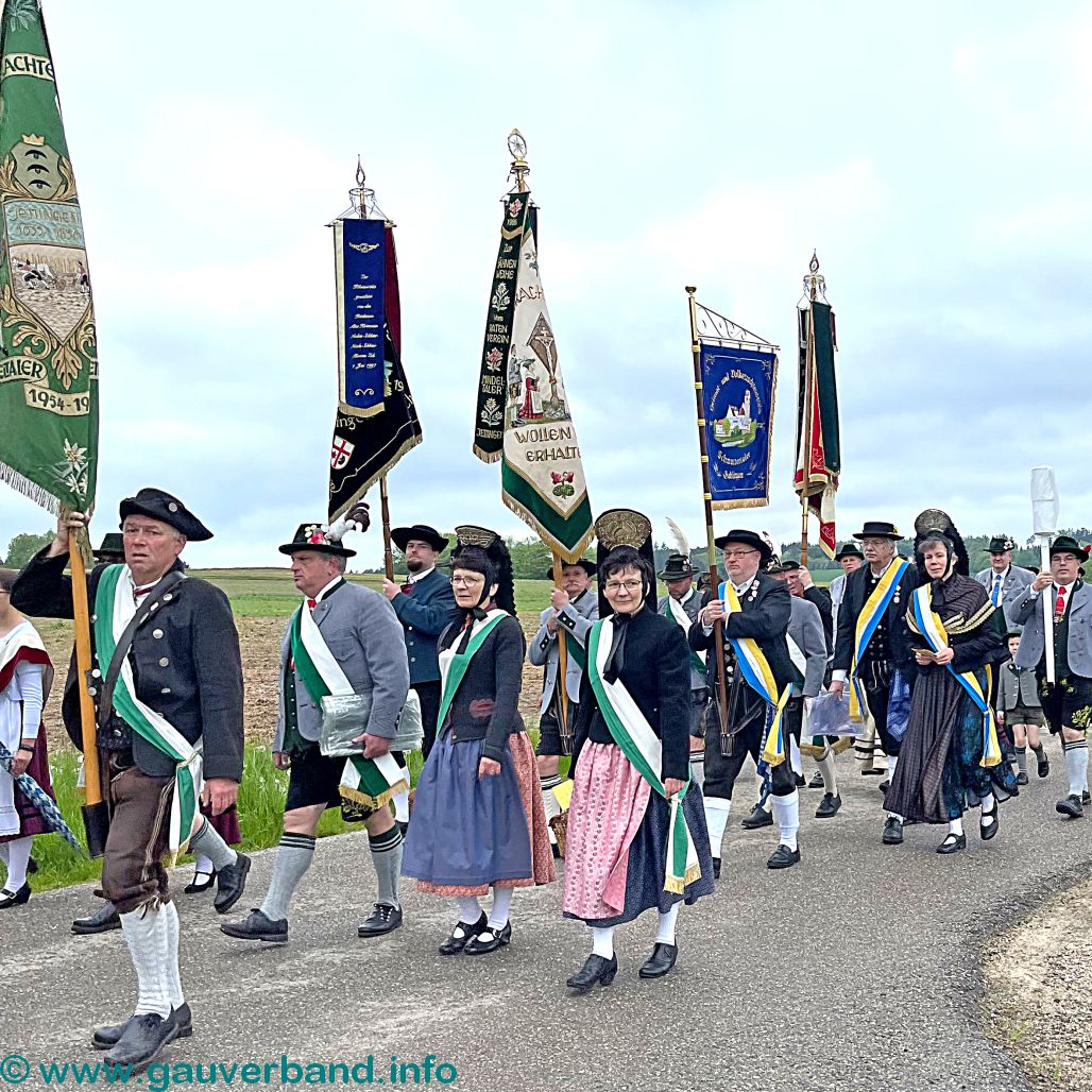 Zu diesem Anlass entschloss sich das Wallfahrtskomittee in Absprache mit dem Gauausschuss in diesem Jahr die Bezirkswallfahrt zur Gauwallfahrt zu machen. Auch wenn der Frühlung im Jahr 2023 ausgefallen war hatten die Pilger dennoch Glück und konnten trockenen Fußes die knapp drei Kilometer Wallfahrt von Altenmünster nach Violau begehen. Begleitet wurde der Zug traditionell von der Musikkapelle Violau unter Leitung von Franz Leipold. Als Vorbeter zeigten sich Georgine Dietrich und Andreas Mordstein, beide vom Trachtenverein Wertingen, verantwortlich. Die Entscheidung mit einem Fahnenblock voran und alle Wallfahrer im Block hinterher zu gehen stellte sich als durchwegs positiv heraus - die Akkustik war deutlich besser als die vergangenen Jahre.