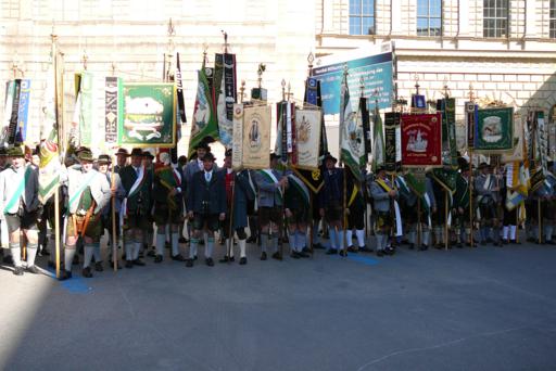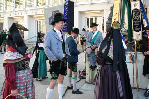 Mit dabei waren neben der Gaustandarte die Fahnen aus Lechhausen und Mering, den beiden ältesten Vereinen im Gau. Dass die Stellproben am Vormittag ohne Probleme verliefen, war uns allen von vorne herein klar, schließlich trafen sich die Trachtler aus Bayern nicht zum ersten Mal zu Repräsentationszwecken.