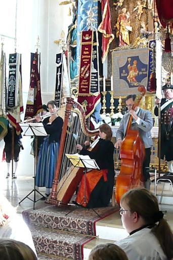 Musikalisch gestaltet wurde der Gottesdienst von der Familienmusik Hinterbrandner aus Lechhausen. Tochter Magdalena an der Harfe wurde von Mama Petra mit der Querflöte und Papa Horst am Bass begleitet.