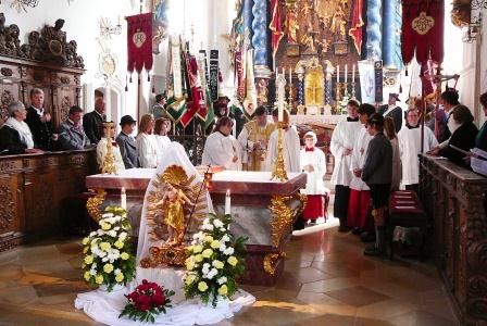 Den anschließenden Gottesdienst umrahmte die Sängergruppe aus Syrgenstein. Leider ging der Zelebrant des Festgottesdienst lediglich in seiner Begrüßung auf die Anwesenheit der vielen Trachtler ein.