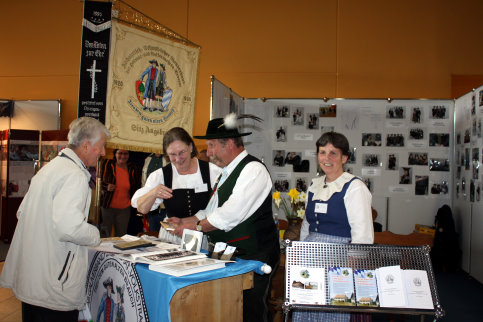 Beliebter Treffpunkt Infostand: Der Augsburger Alt-OB Dr. Menacher - hier mit Matthias Hinterbrandner - war nicht der einzige "Promi" bei uns. Die Näharbeit von Gauschriftführerin Alexandra Oppenländer fand viel Beachtung.