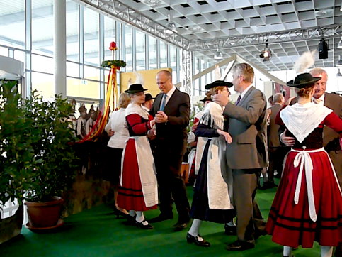 Der Augsburger OB Dr. Kurt Griebl (links) und Bezirkstagspräsident Jürgen Reichert (rechts) sowie die anderen Teilnehmer des Prominentenrundgangs ließen sich von den Mitgliedern der Gaugruppe zum Tanz auffordern.