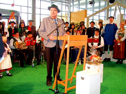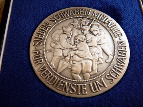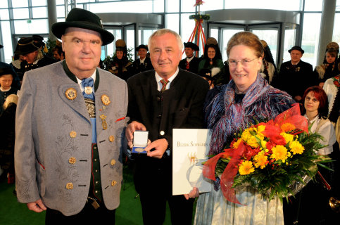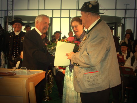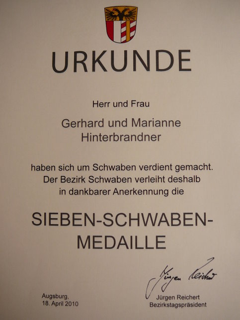 Anläßlich des Auftritts des Bezirks Schwaben auf der Afa - Kultur für alle Sinne - wurde Gauvorstand Gerhard Hinterbrandner und seiner Frau Marianne vom Bezirkstagspräsident Jürgen Reichert die Sieben-Schwaben-Medaille für besondere Verdienste um Schwaben überreicht. In seiner Laudatio würdigte Jürgen Reichert den schon jahrzehntelangen Einsatz der Beiden für die Tracht und die Erhaltung des Brauchtums. Besonders in Erinnerung waren ihm die schwäbischen Kulturtage im Aichacher Land, bei welchen von Gauvorstand Hinterbrandner für den Bezirk Schwaben Türen geöffnet wurden, die bis heute nicht verschlossen worden sind. Auch das diesjährige Engagement auf der Augsburger Frühjahrsausstellung - wobei aus einer kleinen Anfrage des Bezirks ein großes Projekt wurde - fand in dieser Ehrung Niederschlag. Als Anerkennung überreichte er 500,00 € für die Jugendarbeit.