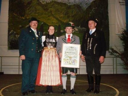 Der Landesjugendvertreter des Bayerischen Trachtenverbandes, Günter Frey, und die Gaujugendleiterin Simone Ritschel, verliehen dem 1. Vorsitzenden Adolf Rettenberger für seine besonderen Verdienste als Jugendleiter seit dem Jahr 1991 das Ehrenzeichen der Bayerischen Trachtenjugend in Gold.