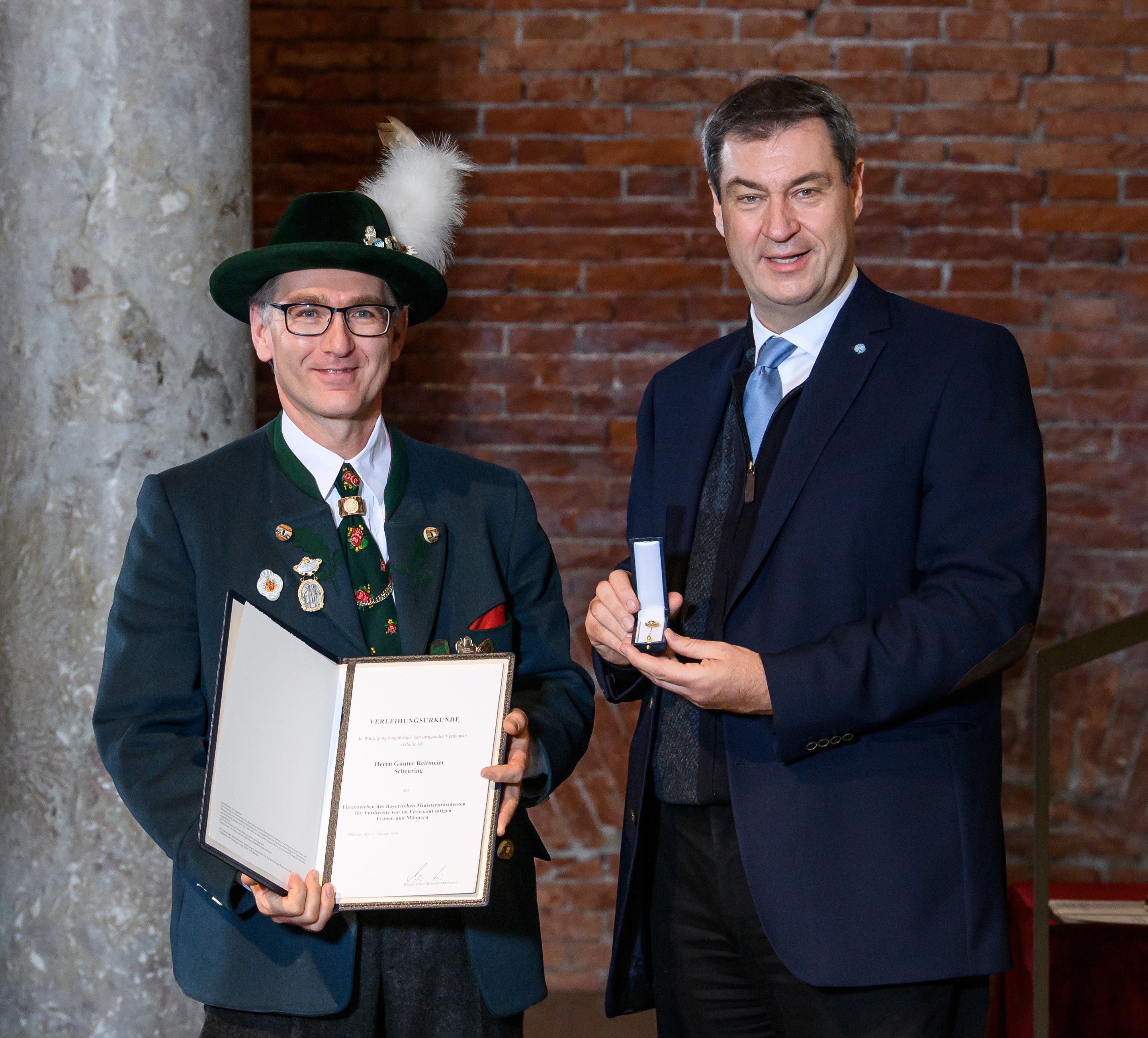 Das Ehrenzeichen des Ministerpräsidenten wurde am 25.11.2019 in der Allerheiligen-Hofkirche in München von Markus Söder an unseren Vereinsvorstand Günter Reitmeier überreicht. Laut Mitteilung der Staatskanzlei ist diese Auszeichnung ein Zeichen des öffentlichen Dankes an ehrenamtlich tätige Bürger, die sich nicht vor Arbeit, Mühen und Anstrengungen scheuen, sondern ihre Aufgaben lieben und bleibende Spuren hinterlassen. Günter Reitmeier lenkt und leitet den Trachtenverein seit über 20 Jahren und investiert einen großen Teil seiner Freizeit in die Vereinsarbeit. Dabei ist ihm auch immer die Nachwuchsarbeit ein besonderes Anliegen.
